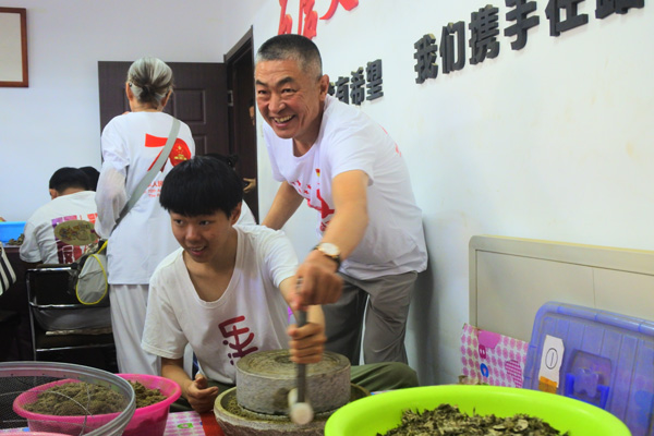 6月25日上午,身為環(huán)翠區(qū)環(huán)翠樓街道辦事處西北村黨總支所屬的思源黨支部書記的李雙舉同近百名黨員和志愿者來到威海市殘疾人就業(yè)服務中心,受到這里所有殘疾人的熱烈歡迎——首先,所屬的12名智障殘疾人為大家獻上了他們提前精心排練的歌伴舞節(jié)目;緊接著,威海市白手杖殘疾人分創(chuàng)新創(chuàng)業(yè)園發(fā)起人、知名盲人志愿者、帶動智障者參與創(chuàng)業(yè)的石磨艾坊創(chuàng)始人姜新發(fā)表了熱情洋溢的歡迎辭;隨后,一行興致勃勃地參觀了石磨艾坊加工車間和成品展示廳。