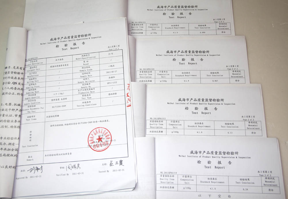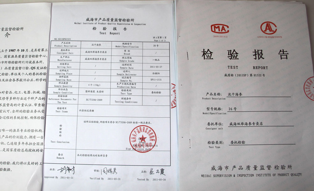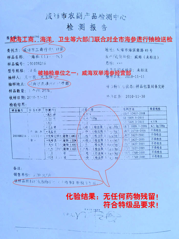 (附:2010年威海市六部門聯(lián)合執(zhí)法對全市海參市場摸底大抽查,其中威海雙舉海參化驗結(jié)果無任何藥物殘留,符合特級品標準!)