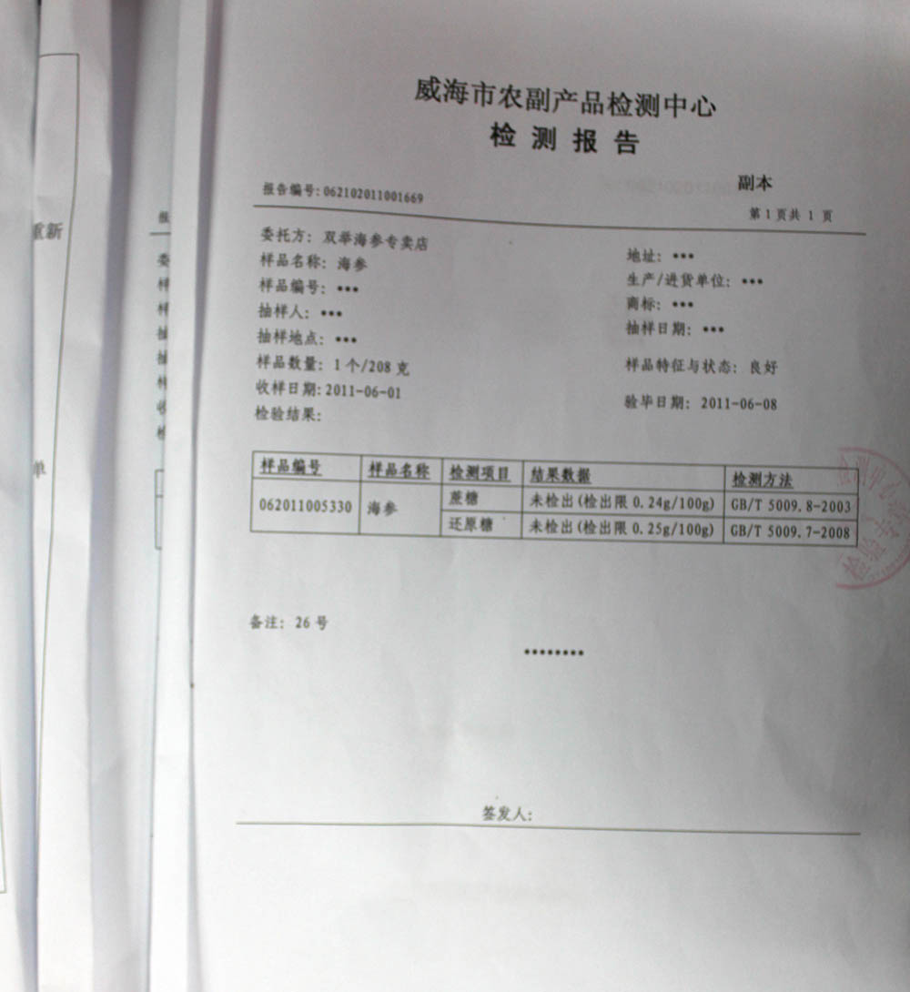 第二道關:經(jīng)進貨委員會同意購進的海參須把樣品分別送至威海市質(zhì)檢所、威海市農(nóng)副產(chǎn)品檢測中心化驗,確認各指標合格(純淡干海參不含糖份),出具化驗報告后方可購入,若化驗不合格,憑檢驗報告退回供貨商;