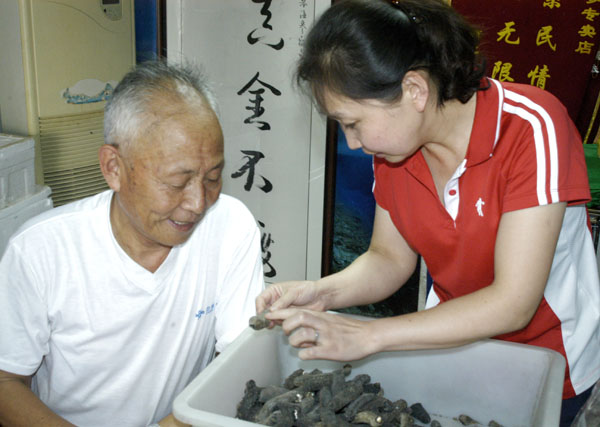 李彩卿在給大叔精挑細(xì)選每一個(gè)海參,她說:“大叔,我專給您挑刺短根粗肉又厚的,這種才是您要的深水野生海參?!?